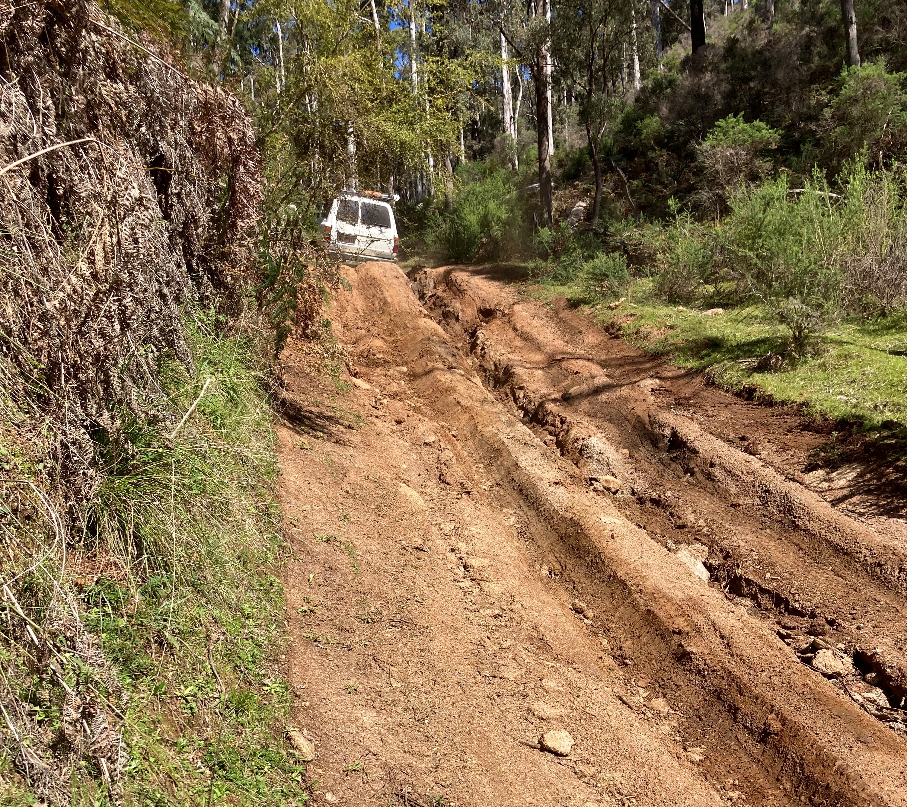 Some would think this is a well rutted and steep challenge, but not us, we were up to the challenge. The old Nissan (Chris) got to the top and then it was the turn of the old 80 series (Bill). At approx. 2/3 of the way up the struggle began and the navigator (Anne) got out, and said see you at the top. Some say it almost rolled (exaggeration) but with a bit of perseverance we got there. Then the new Landcruiser (Richard) just cruised up. Not that hard a track.